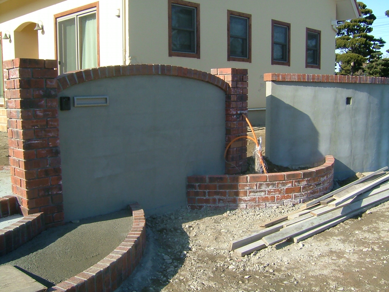 まず、駐車スペースとの境の塀をブロック積みし、上にレンガの笠木を並べました。モルタルで下地処理をした塀は、あとでお家の外壁に似たクリーム色で左官仕上げをしてもらいます。