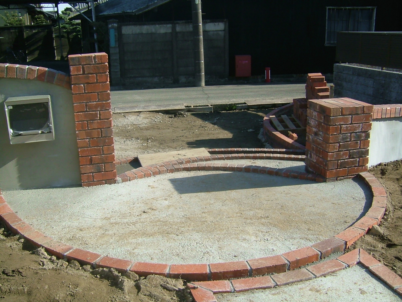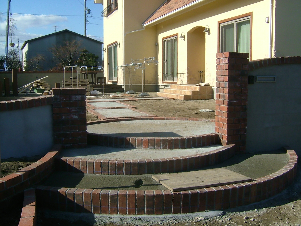 玄関へと続くステップのアプローチ部分です。ステップは見栄えがするよう、大きめのR型にデザインしました。ステップ部分も見切りにはレンガを敷き、今はまだモルタル下地の踏み面には天然石を敷きます。