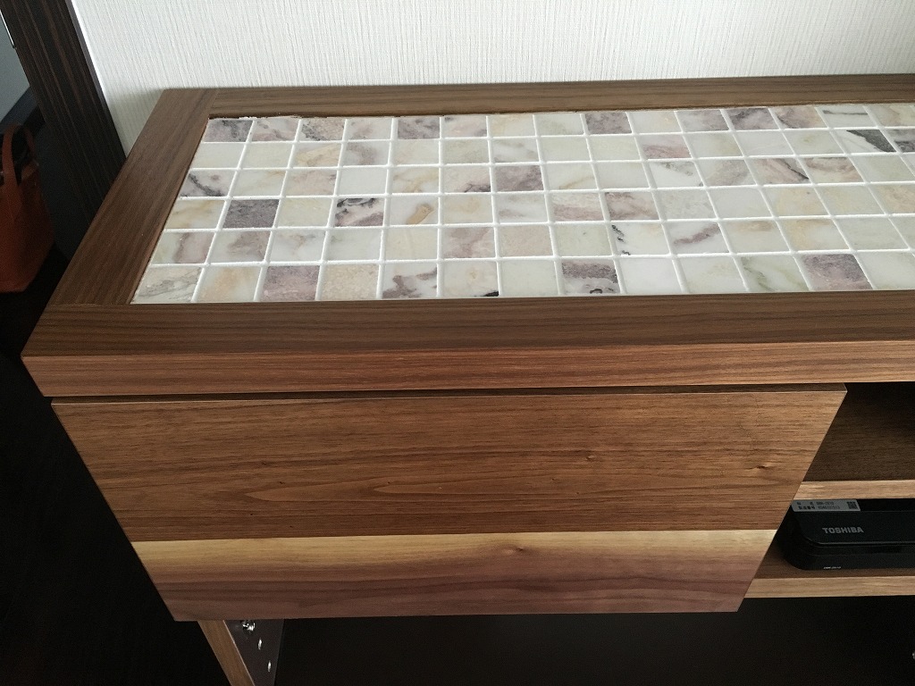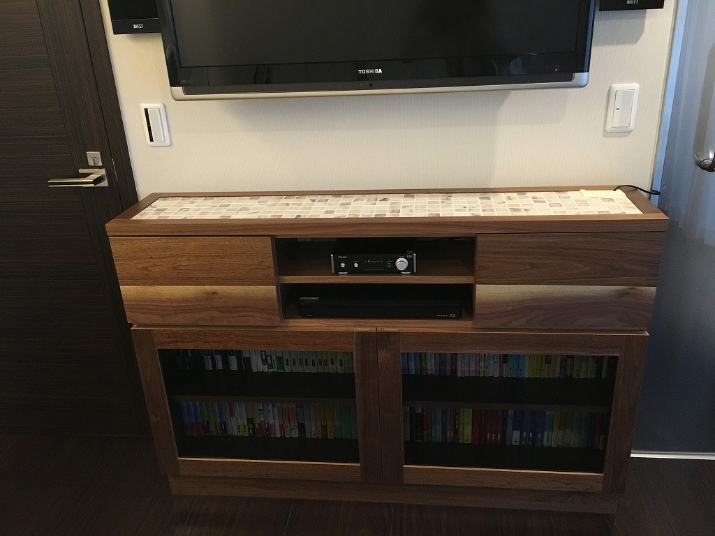 全ての家具の仕上げ材は(株)ニッシンイクス リアルパネル ウォールナットラスティックを採用。節があったり白い部分があったりと表情があるので、お客様も喜んで下さいました。