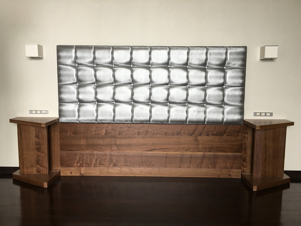 ベッドヘッドとナイトテーブル。ヘッドのフェイクレザーがいい感じにかっこよくなりました。