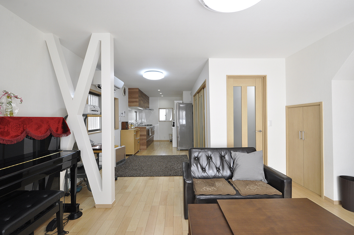 構造上必要な筋交い部分(写真左側)はあえてあらわしにして明るくて開放的な空間に。