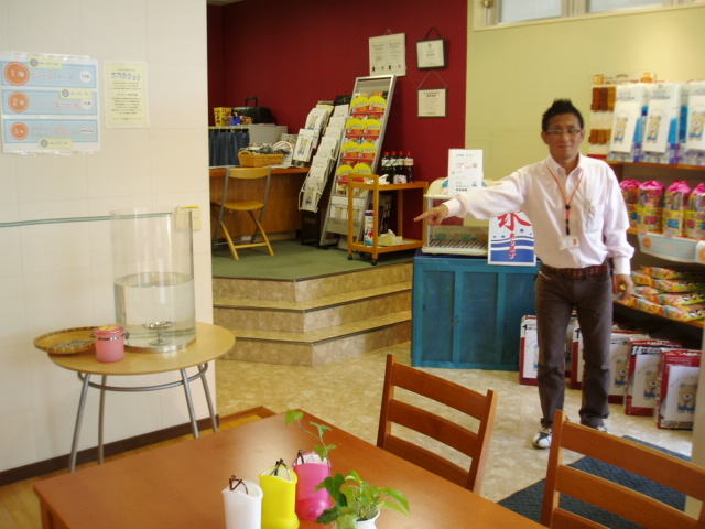 上の写真のちょっと変わった人が(店長)指差している円柱形水槽にコイン落として中のお皿にコインを何枚のせる事ができるかが勝負です