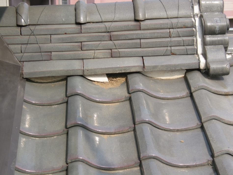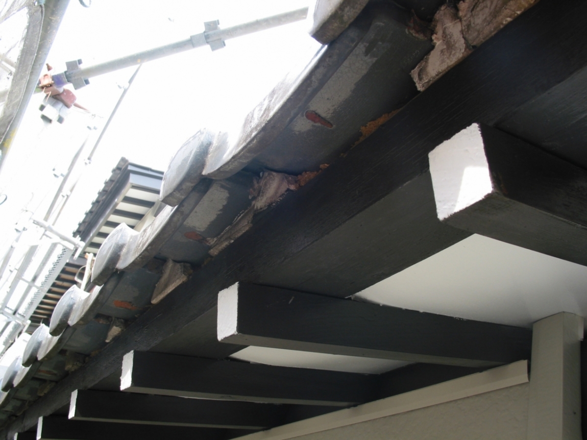 ところで、先日、外壁の金属サイディング貼り、塗装工事、板金・樋工事をさせていただいた現場で、外部足場を設置し、軒樋を取り外したところ、軒先の面戸漆喰が写真のような状態でした。