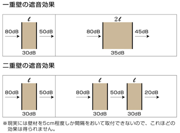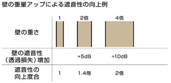 壁の重さが2倍になれば5~6dB、4倍になれば10dB(2倍)向上します。一般的に木造に比べRC造など重い構造の方が遮音性能に優れています。しかし単純に今と同じ壁を4重にしたとしても音は1/2しか小さくなりません。