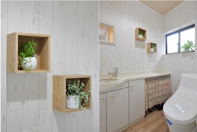 トイレに可愛いボックスをつけるとグリーンを彩ることもでき、清潔感がアップしますね。限られた小スペースの水まわりでも壁に棚をつければ遊べます。奥にそっと芳香剤を忍ばせてさりげにエチケット対策をするのもオススメ。