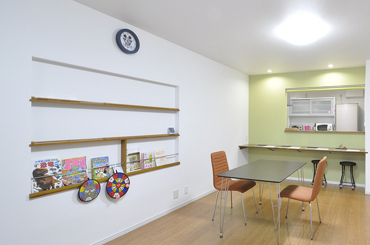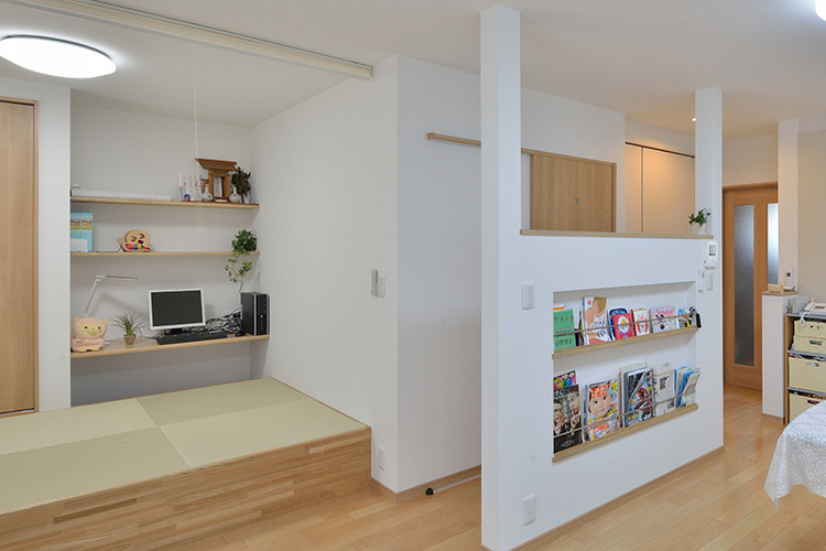 間仕切りの壁にマガジンラックを、畳の小上がりスペースにワークスペースをつくりました。