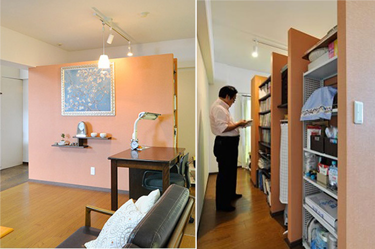 壁と思わせ後ろには一面の収納。部屋をつくろうと考えなくてもこのロー高さの壁一枚で収納空間ができあがり。少ないスペースで本、日用品、電化製品をしっかり収納できます。扉を付けなくても隠す収納はつくれますよ~