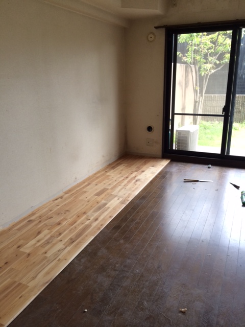 まず、床は無垢のフローリングをこんな感じで上張りさせていただきました。