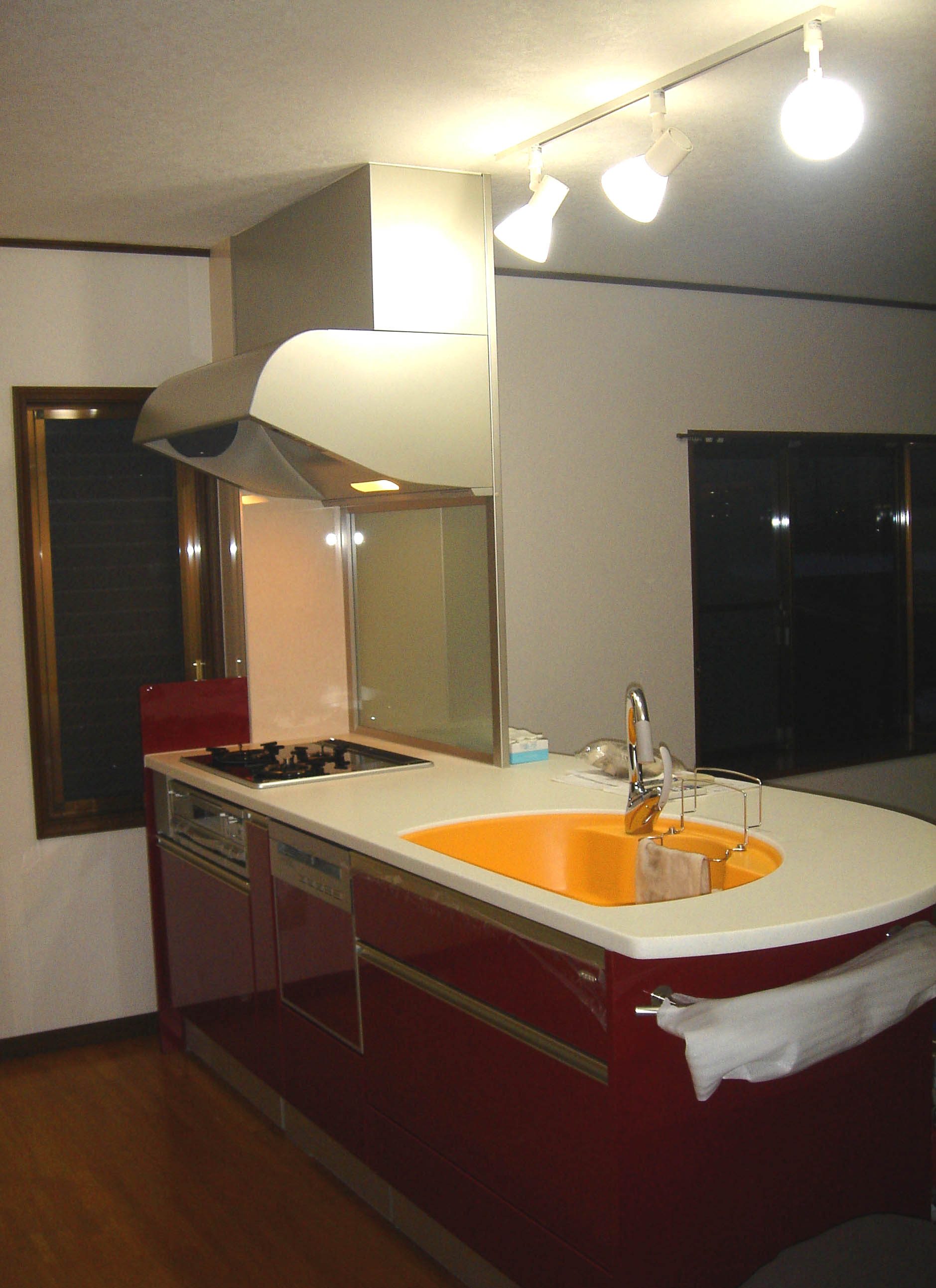 シンク部分の新色のオレンジがとても素敵な対面キッチンです。