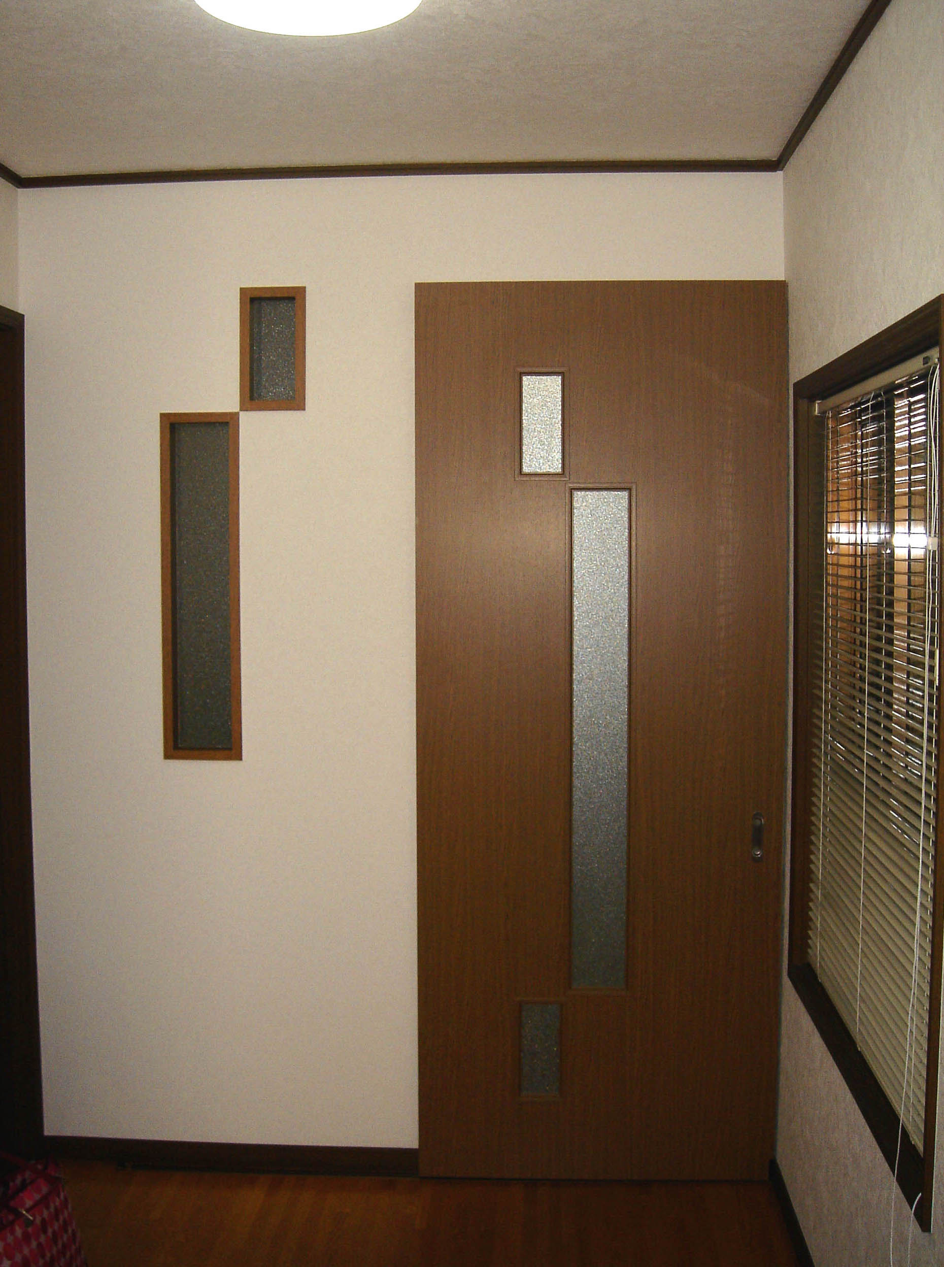 写真のようなアウトセット建具はよく作らせていただきます。扉のガラスのデザインを、いつも、何パターンかご提案しますが、縦ラインや小窓が2~3つ付いたもの等、シンプルですっきりしたデザインを皆さん選ばれます。今回は、初めて少し変わったデザインをご採用頂き、うれしかったです。隣りの小窓もお揃いです。