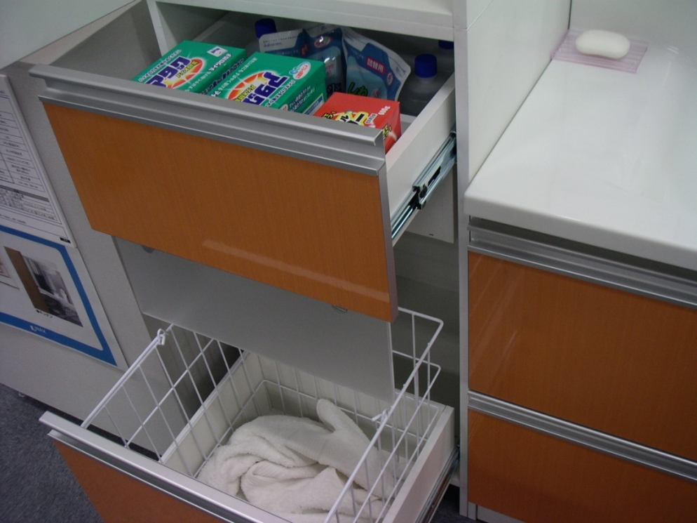 INAX洗面2 引き出しのサイズは、大変よく考えられているので、粉末・液体洗剤・つめかえ用がちょうどぴったり入ります。