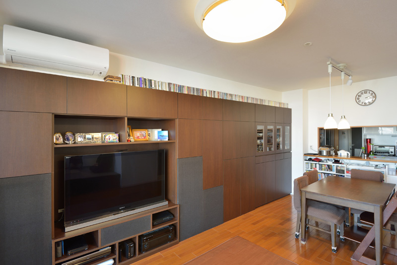 壁面収納にはオーディオ類、小物類、食器棚も一体になっています。