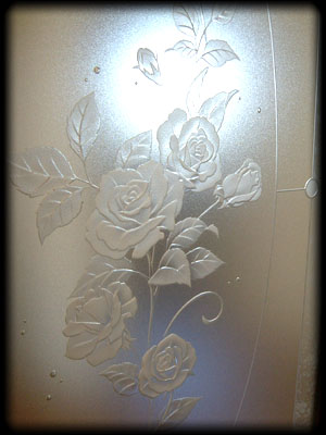 写真のデザインガラスはエッチングガラスといいます。ガラス面に特殊な砂などを吹き付けて彫刻するんですが、立体的な表現もできてお部屋の顔にもなってくれます。