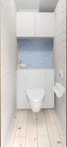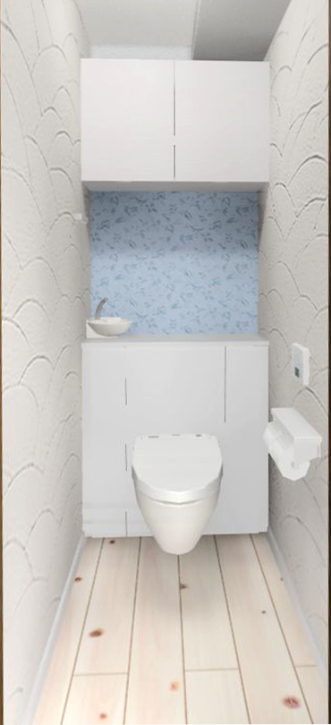 そこで、TOTOレストパルI型カウンター手洗付という商品で、ご提案しました。サイドに設置するモダンな手洗器より、背面の丸い手洗いボウルが可愛いですよね。もともとあった白い吊り収納と、カウンターで出来た凹部分の壁には、アクセントクロスを貼ります。下がその時ご提案したCGパースです。