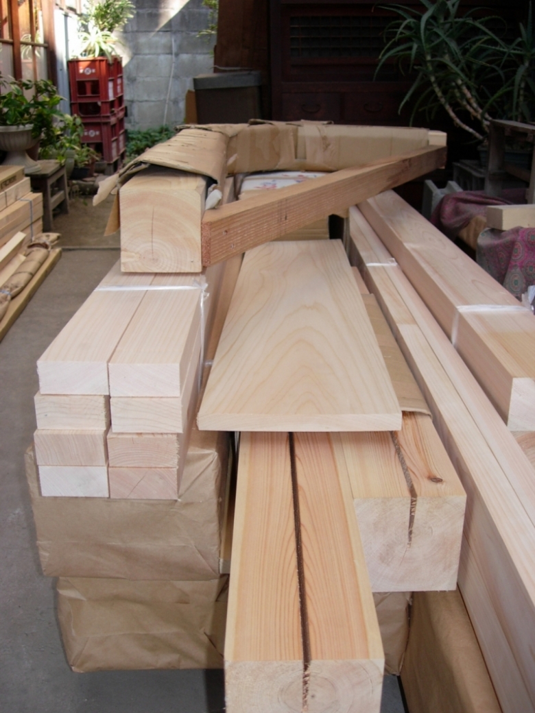 古いお宅ですので、材質にもこだわって床材は無垢(ヒノキの間伐材)を取り寄せて施工中です。