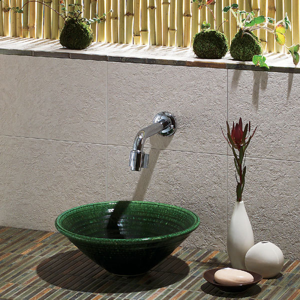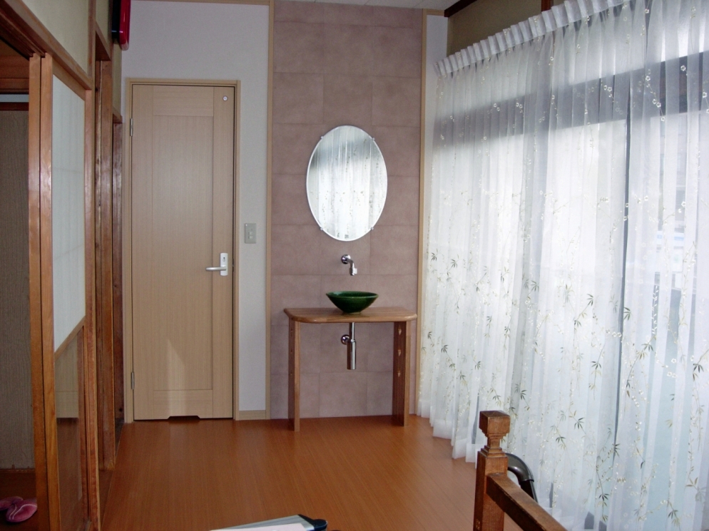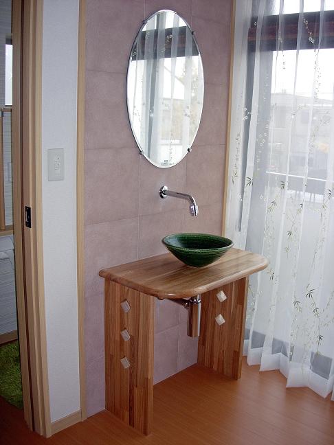 このきれいな緑に合わせて廊下を山桜のように仕上げましょう・・・という訳で、手洗い器の後ろの壁は灰桜色(本当にこういう色名がついています)のタイルを貼りました。
