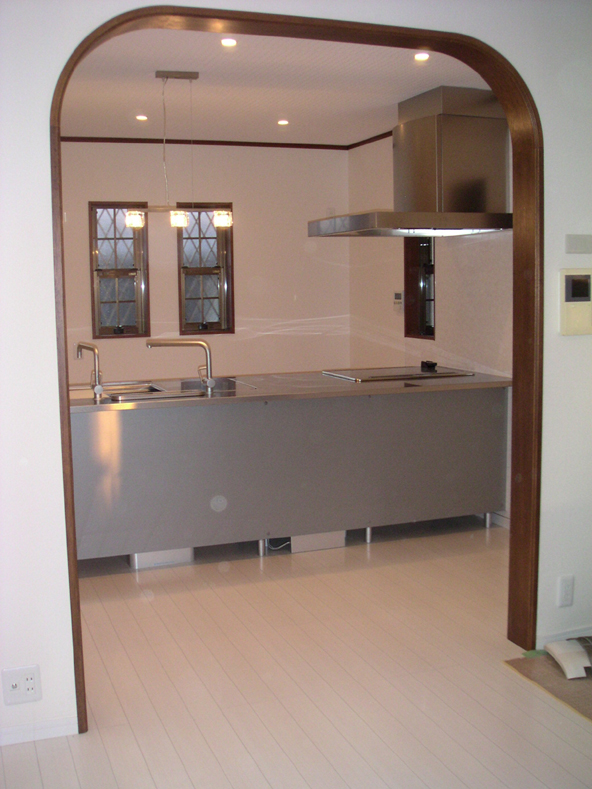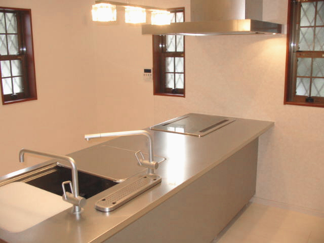 窓はキッチンの位置にあわせて上げ下げ窓にしました。