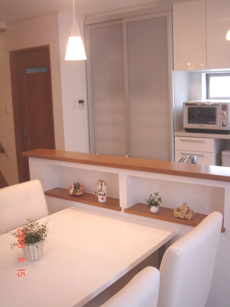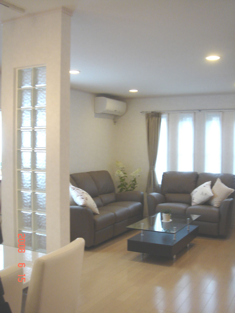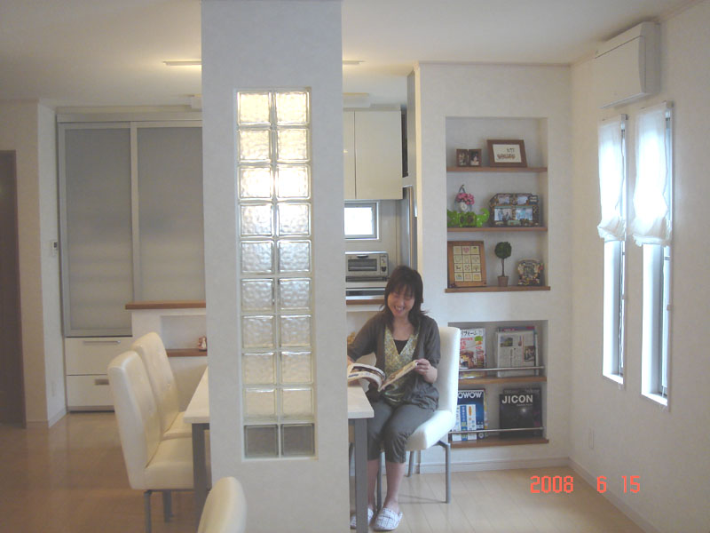 LDKを広くしたため、構造上、抜けない柱や筋交いなどがあり、当初プランニングには悩まされましたが、リビングから一体となったパソコンコーナーとのさり気ない仕切りにしたり、ガラスブロックをアクセントにした袖壁をテーブル脇に設け、ダイニングスペースとリビングスペースとの仕切りにしたりと、違和感の無いようそれらを考慮した間取りを計画しました。