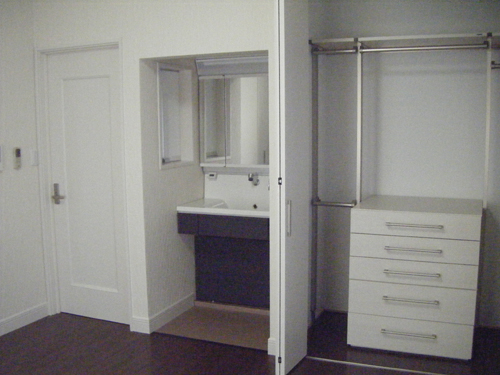 廊下にあった洗面台を、室内側へ移動し、ドレッサーとしても使える様にしました。クローゼットの中にはPanasonic電工のi-Shelfというユニット式の商品が設置してあります。 色んな種類・形があるので、一度見てみて下さい