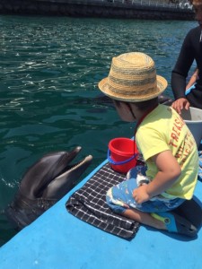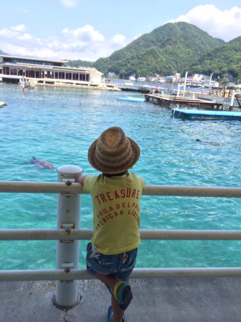 地元では水族館へ。息子は果敢にイルカのエサやりにチャレンジ!