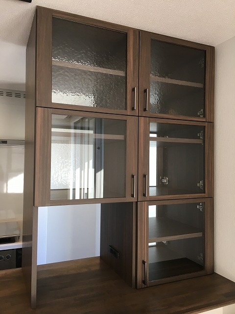 食器棚部分はダイニングからもキッチンからも使えるようになっています。目線部分のガラスは透明にし、ディスプレイ感覚でお気に入りのグラスや食器などを収納出来ます。