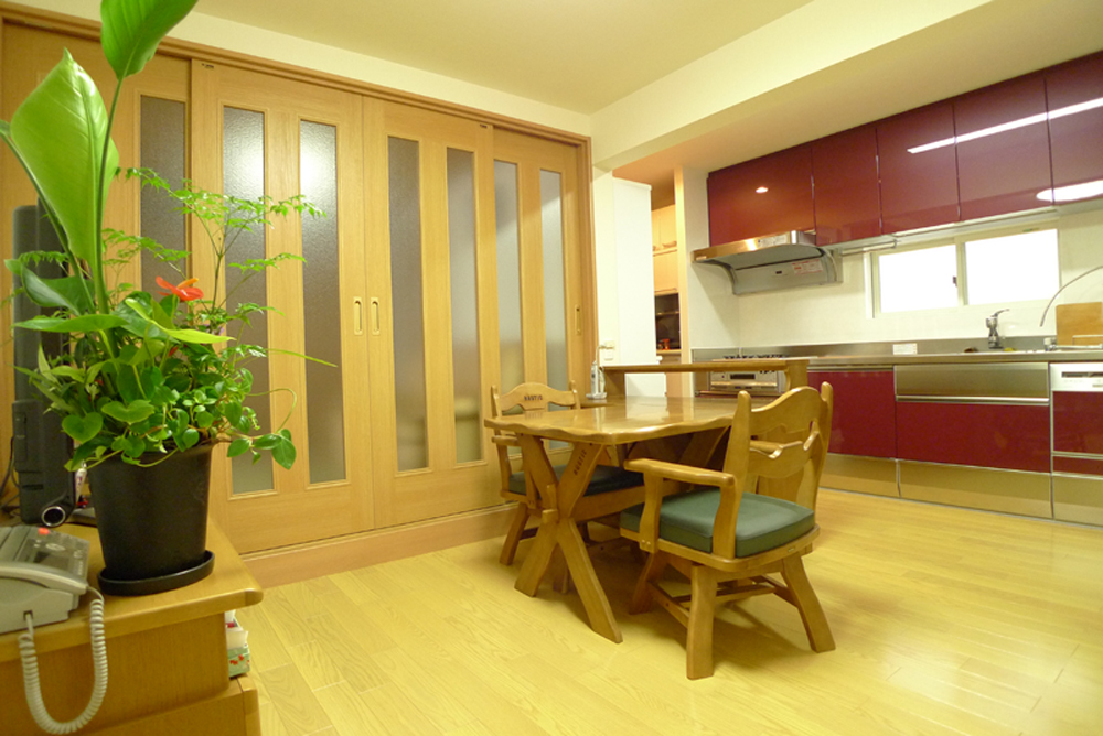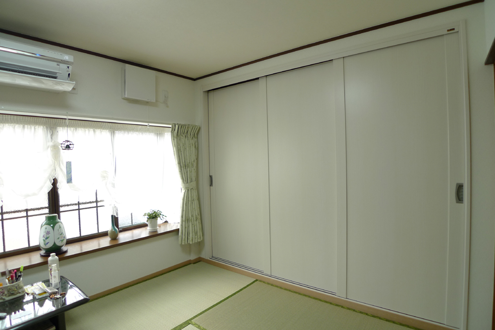 和室の収納扉は以前折戸になっていたのですが、金物が壊れているし、折戸は使いにくいという事でしたので、3枚の引き戸にし使い勝手をよくしました。、色はホワイトにする事で部屋全体が明るくなりました。