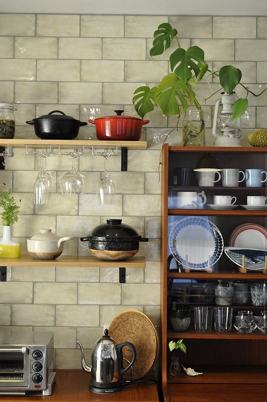 チークの無垢フローリングや、各所に使われたタイルがポイントです!
