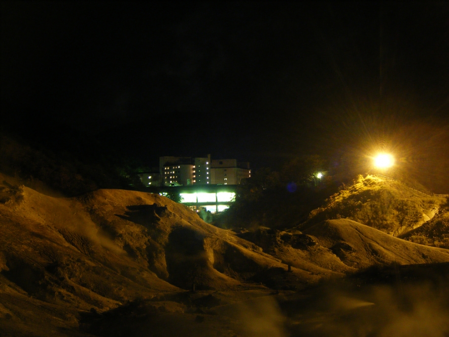 ライトアップしている地獄谷(源泉が湧き出ている所)へ。