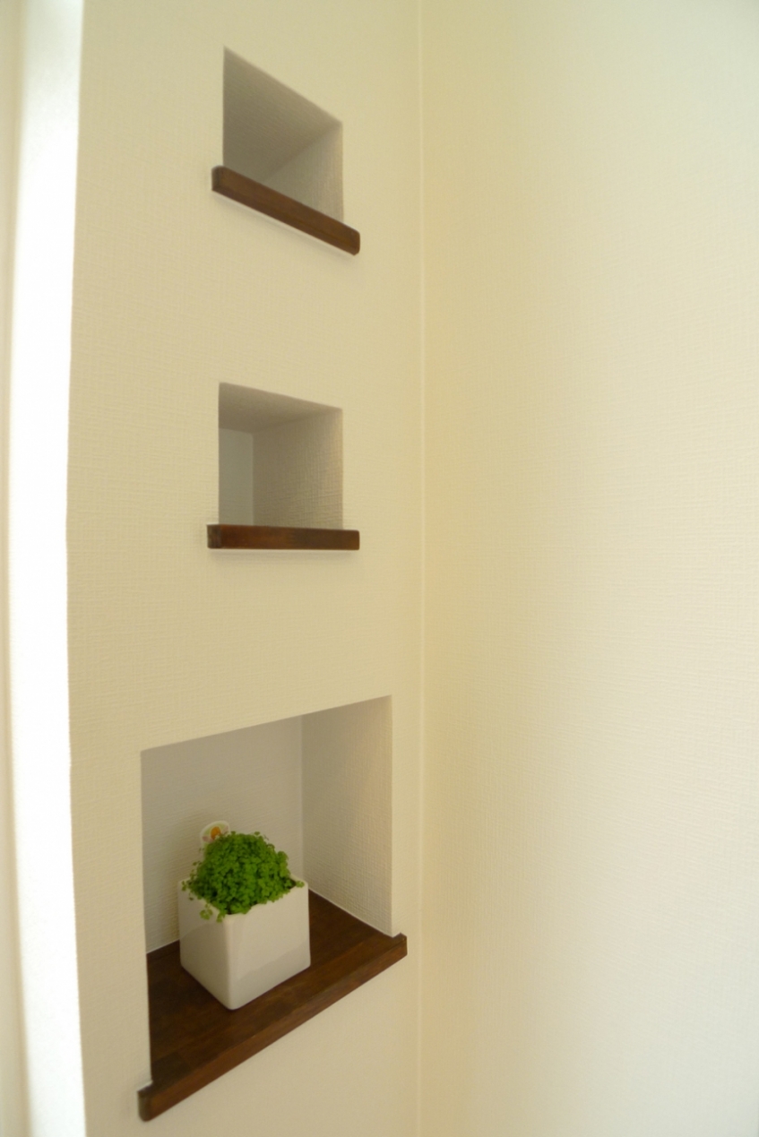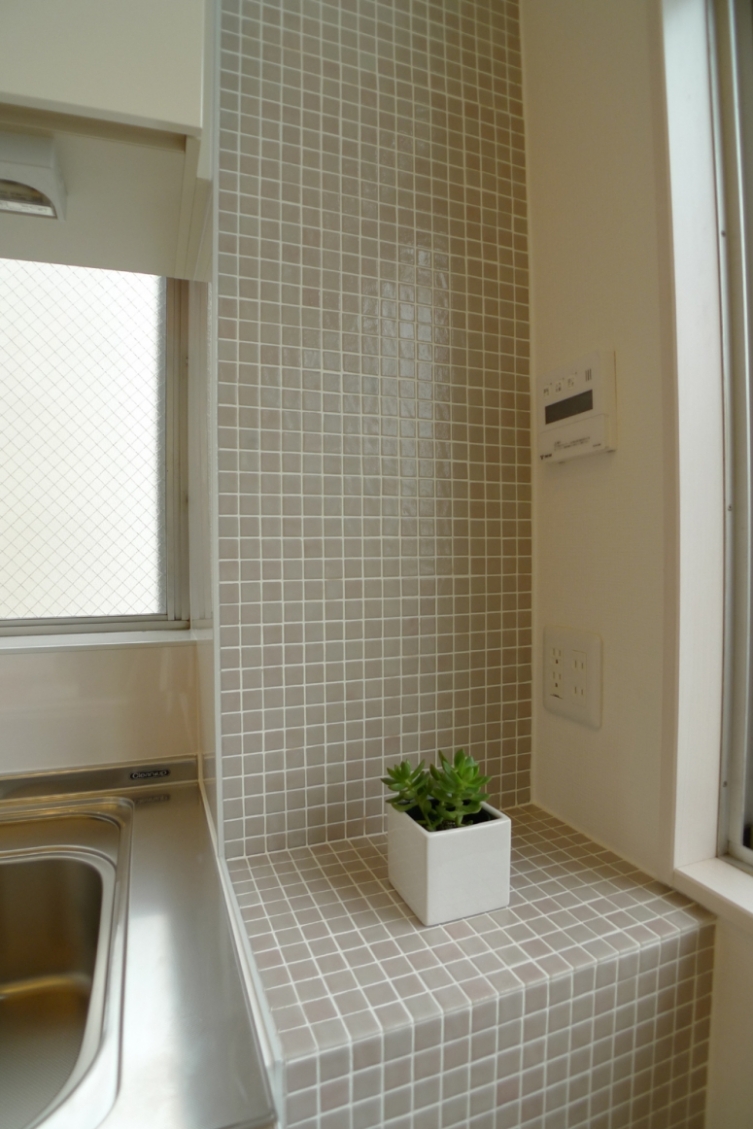 キッチン横の柱にモザイクタイルを貼り、白いキッチンのポイントにし、給排水の配管をする為に壁が中途半端に出てきてしまうので、ニッチを造りました。
