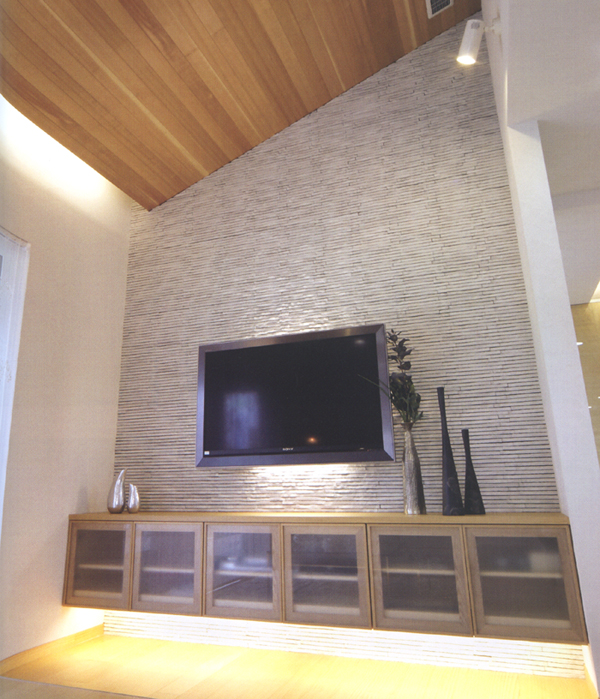 特に、壁掛けTVのバックにタイルをあしらったアクセントウォールの事例は