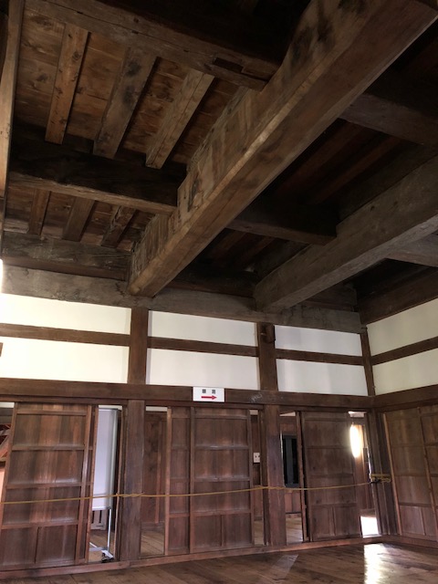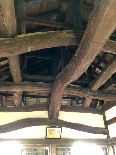 とても大きな梁が印象的。右側の写真は最上階の梁です。こんなくねくねしているのにしっかりと組み上げているのにはとても感動しました。素晴らしいですね。改めて大工さんの技術力には脱帽です。