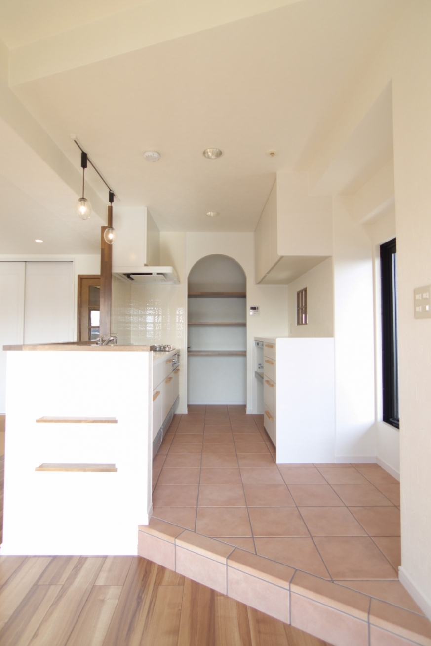 キッチン部分のみ床はタイル貼り、その他部分はフローリングです。