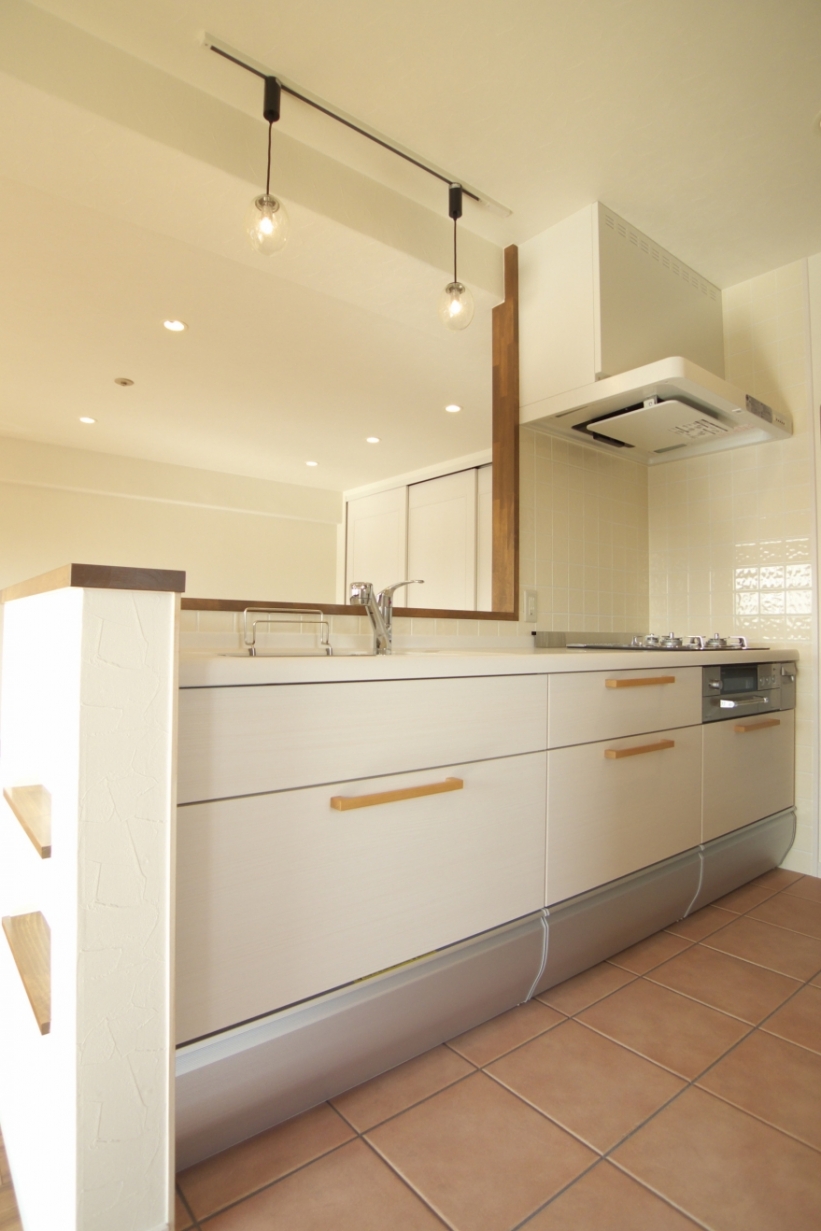 キッチン周辺の壁も、クリームがかった優しい色のタイルを貼らせていただいて、温かい雰囲気になりました