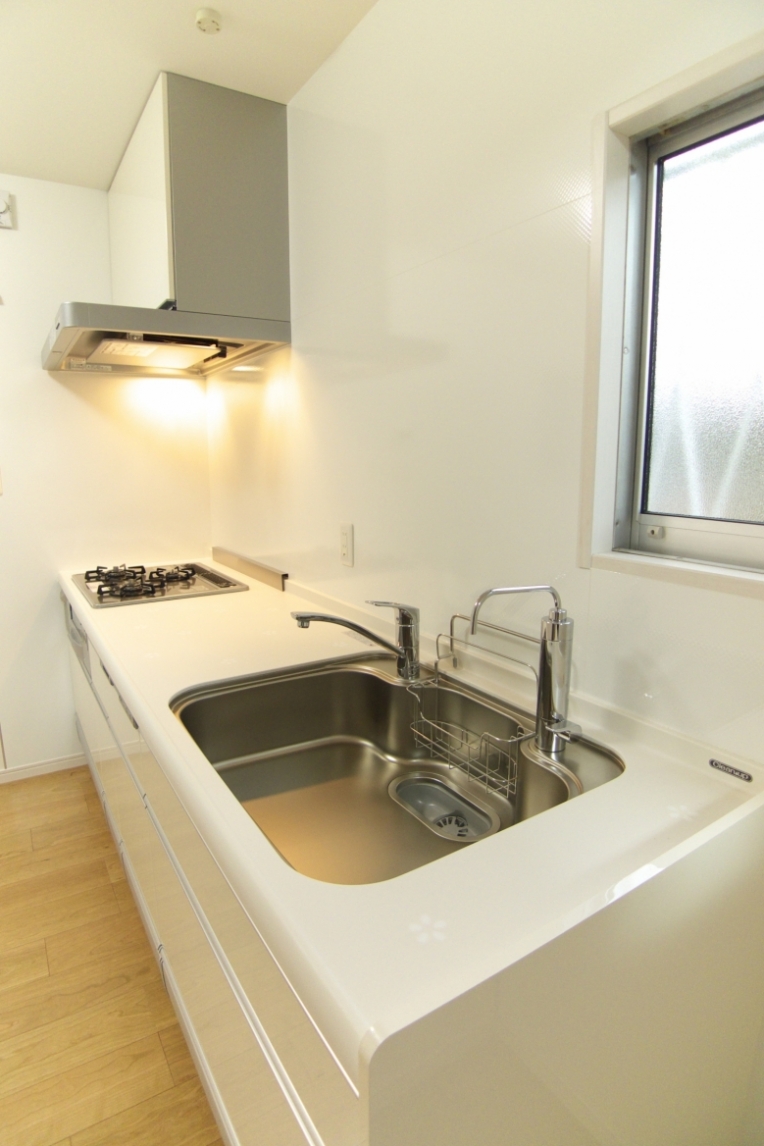キッチンも、壁も、床以外を白で統一したので、もともと広いLDKがさらに広く明るく感じられます