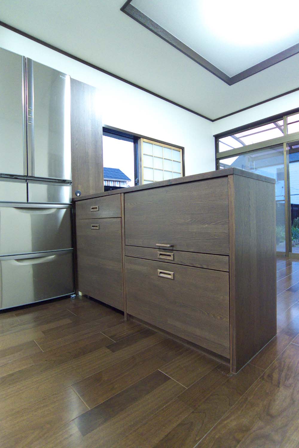 使用される電化製品もできる限り隠せるようにと作らせて頂いたカウンター収納↓。両面から使用できるようになっています。