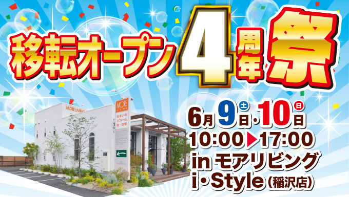 そして、今週末6/9(土)10(日)は稲沢市アイスタイルで移転4周年祭が開催されます。 大抽選会やお得なリフォーム商品、お子様には輪投げやお菓子詰め等もご用意しております。是非、皆様遊びに来て下さい。