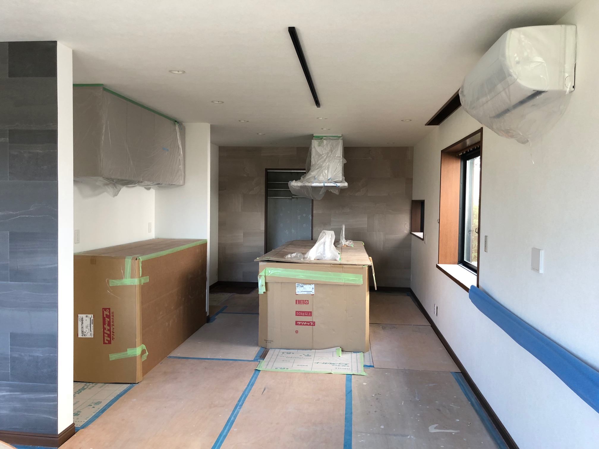空間を贅沢に利用して設置したアイランドキッチン。ご家族やお友達と会話しながら料理が出来ますし、キッチンの廻りを回遊出来るのもいいですね。をこの養生が取れるのが楽しみです。