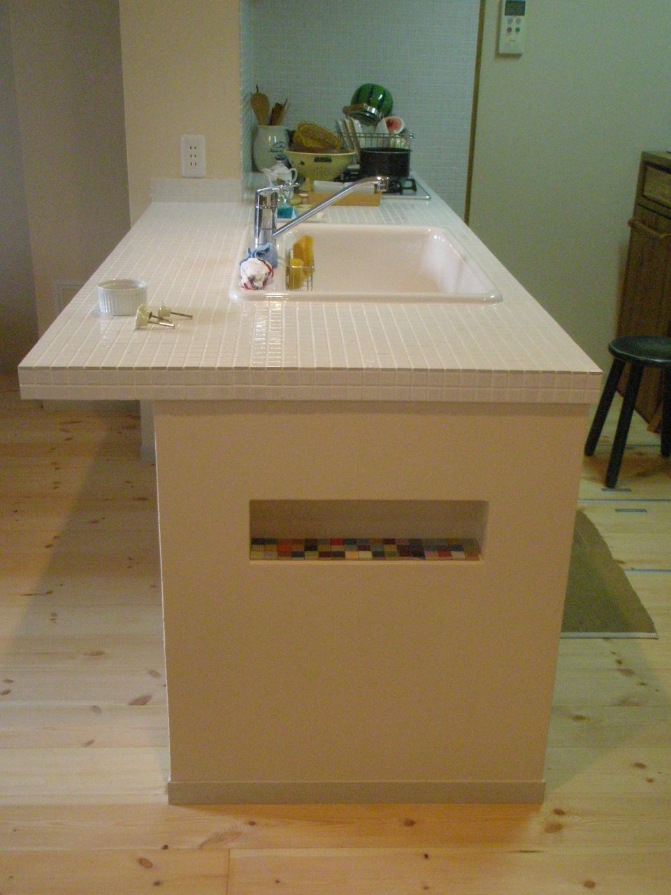 どうしても出てしまった鉄骨の柱にタイルを貼り、