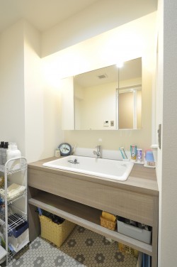 造作の洗面台。大きく深さがある洗面ボウルごご希望で、TOTOの実験シンクを採用しました。