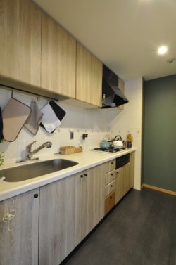 奥様こだわりの壁と床のカラー。キッチン扉はDIYでシート貼りをされていて、とてもキレイに貼られていました。素敵な空間ですね。