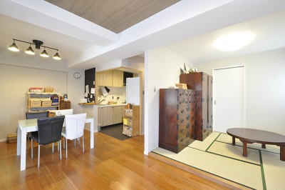 扉で繋がっていた和室は、扉や壁を撤去し、リビングと一体的な和室に間取り変更。広々としたリビングになりました。
