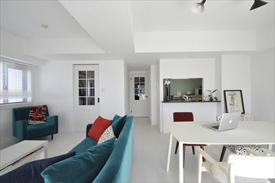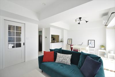 LDKは白を基調とした清潔感ある内装で、鮮やかな色の家具や小物がアクセントになり、楽しくも洗練された印象になっていました。