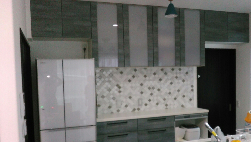 先日、H様邸でキッチン背面収納の設置と、その吊戸棚とカウンターとの間の壁面に