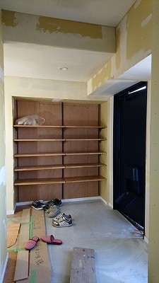 さて、現在着工中のお宅ですが、玄関土間を広く取り、アウトドア用品もたくさん収て頂けるよう棚もたくさん取付け予定です。