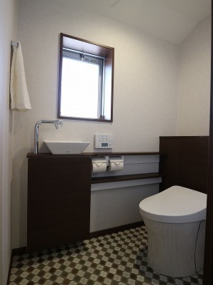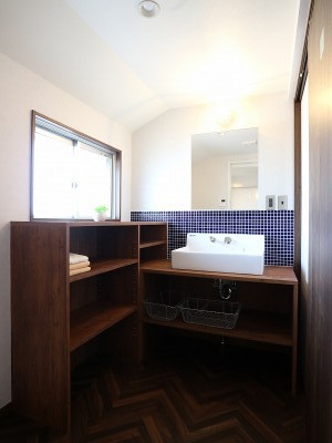 洗面台はオリジナル。棚もありタオルや下着、小物など使い方次第で色々と収納出来ます。背面にはタイルを貼りとても素敵になりました。
