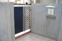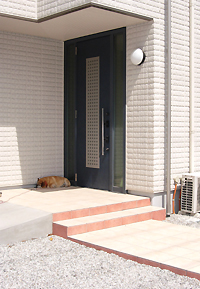 この建物を更に素敵に見せる外構工事って…と考えたのがブルーとステンカラー、コンクリート打ちっ放しという構成でした。でもそれだけではそこの住まわれるお客様の暖かさが伝わらないような気がして、アプローチのタイルの蹴上げに少しだけ赤を足してみました。