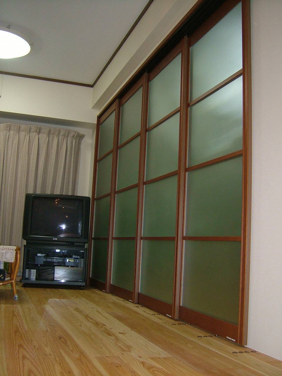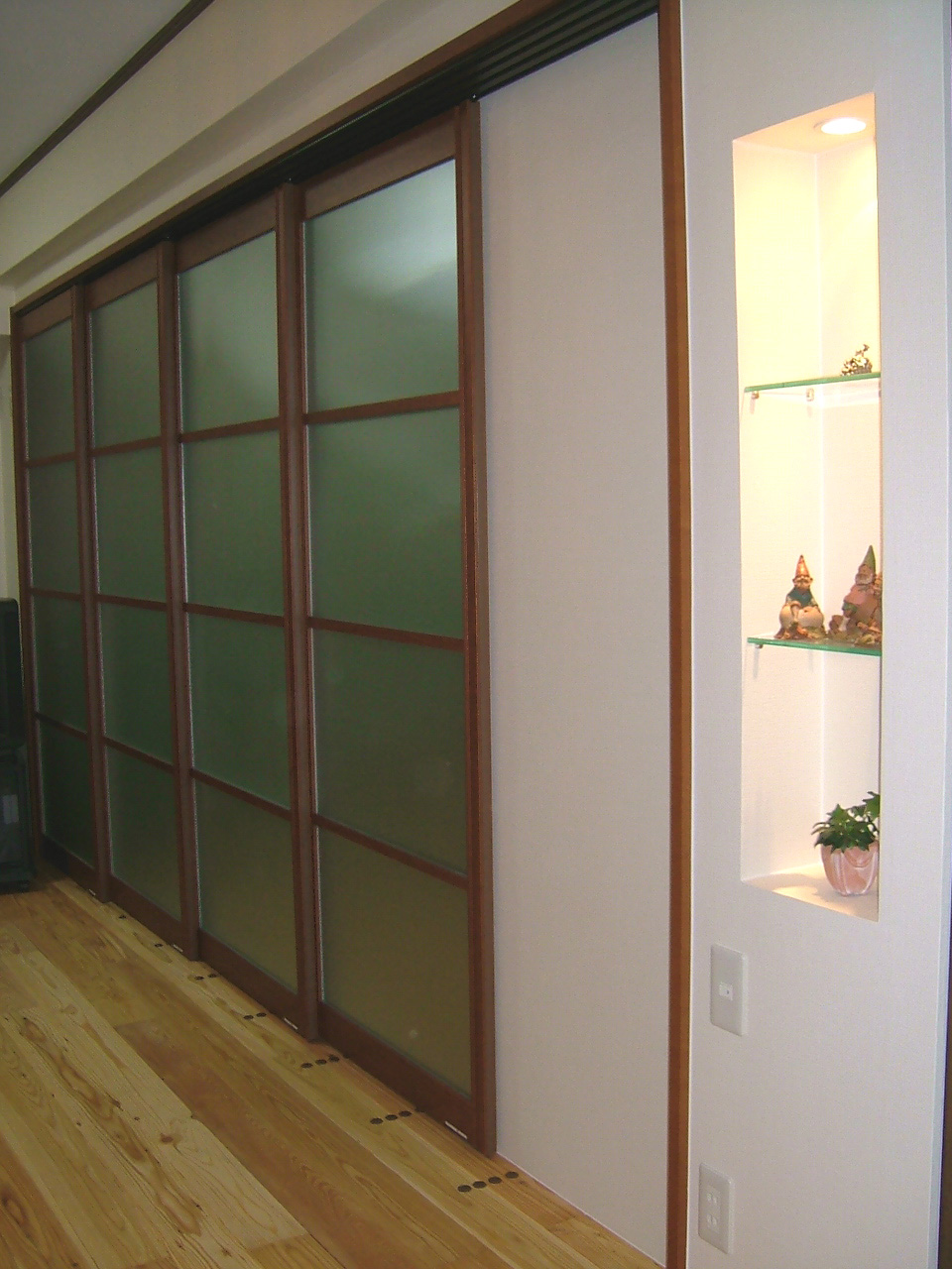 その他にも、リビングとそのお隣にある洋室との間には、4枚扉の間仕切り建具を設け、普段は開けたままでワンルームとして広々と使い、娘さん達がお泊りになる時などはご寝室として仕切る事が出来る、多機能な建具です。また、リビングからつながる和室の障子も、間仕切り建具に似せたデザインでワーロンを使って作りました。