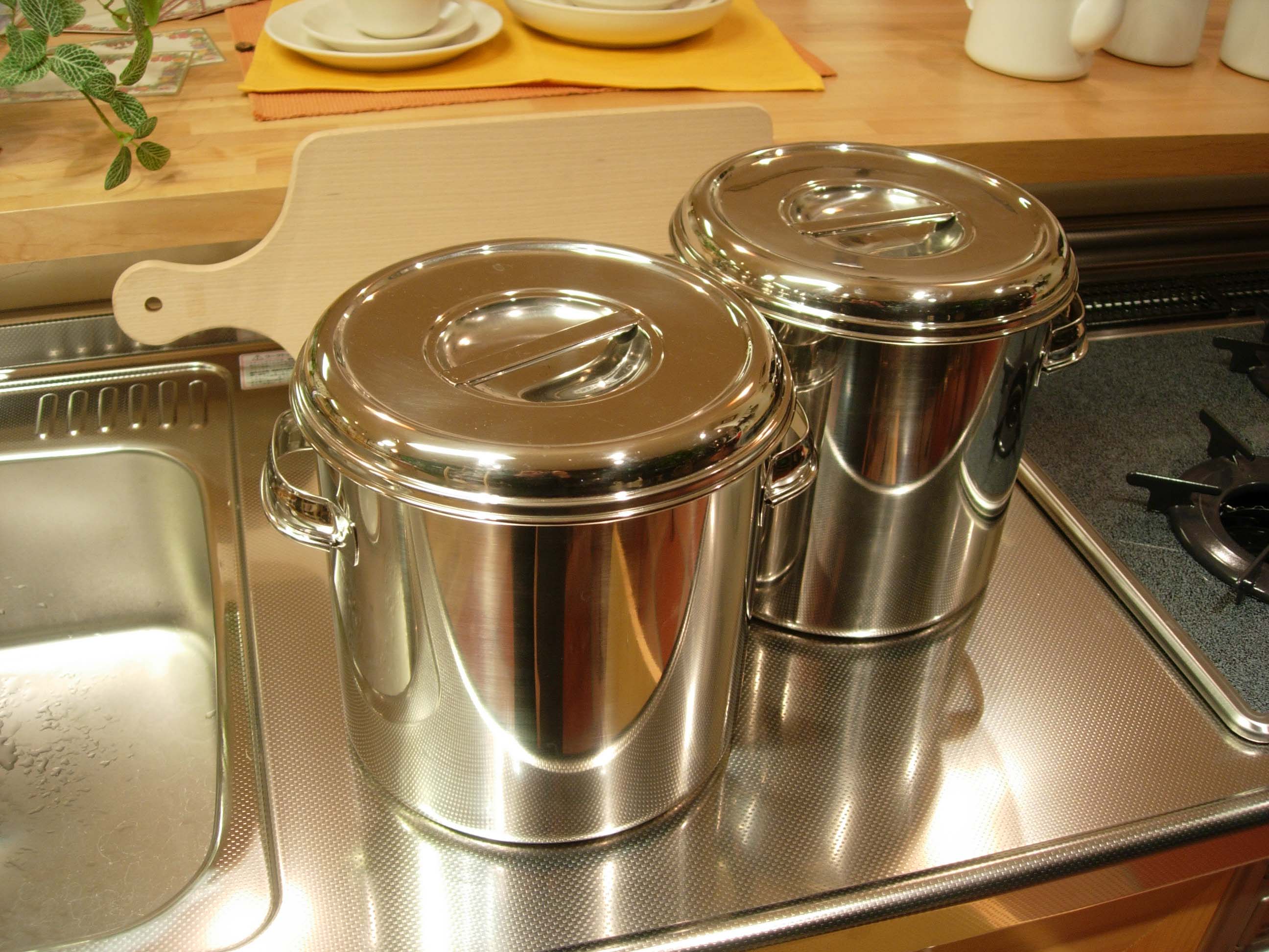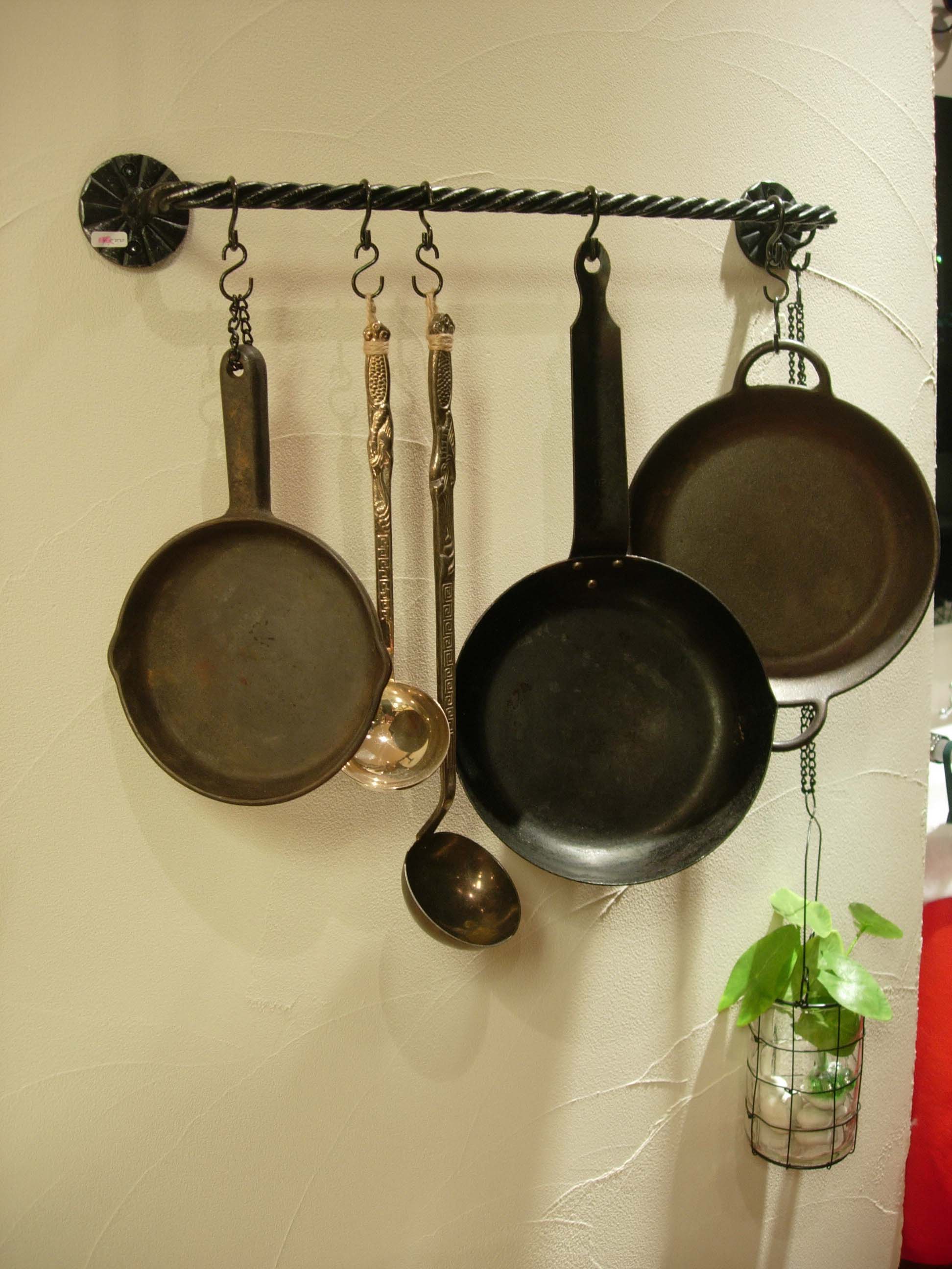 このフライパン達は、全部中古品なんですよ。 近くに中古の厨房用品店があり、行ってみたらインテリアにも使えそうな掘り出しモノがいっぱい!!で、うれし楽しくなりました。シルバー色のどこかで見たことあるな~というカンカンは、ショールームキッチン廻りのきれいなゴミ入れとして使っています。ディスプレイを兼ねた収納にもなりますよね。 中古の○○店やプロショップというのも、特にインテリア好きの方にはお勧めです。
