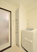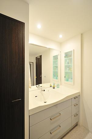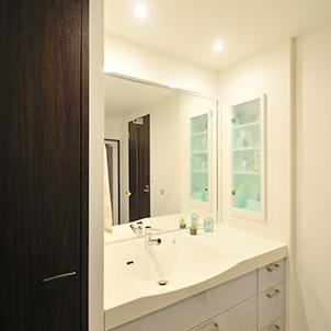 間口の広さを生かし、2列に分けた引き出しで効率よく収納できるパナソニックのラシスを採用。浴室を少し小さくし、空いたスペースにはトールボックスを設置。収納量も増えました。