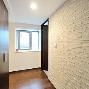 ワンポイントで調湿やにおいの吸着ができるエコカラットタイルを貼り、インテリアのアクセントとしました。